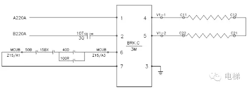 2.當(dāng)抱閘控制方式為接觸器驅(qū)動時,使用日立HSGL型主機(jī)或廣日主機(jī),使用抱閘接觸器對抱閘供電控制,控制柜內(nèi)有BDR及BSR制動電阻。其抱閘控制回路如下圖所示: